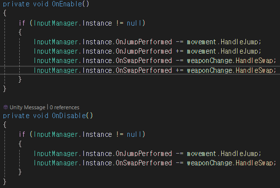 InputManager의 Action에 콜백함수를 바인드하던 OnEnable 함수와 OnDisable 함수를 제거하고