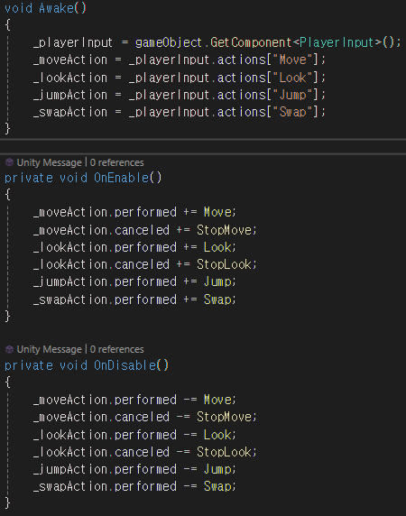 - _swapAction 멤버변수 : PlayerInput 컴포넌트에서 참조중인 Swap 액션