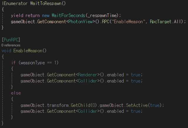 무기의 타입에 따라 습득한 무기를 비활성화하고 WaitToRespawn 코루틴 함수를 호출한다