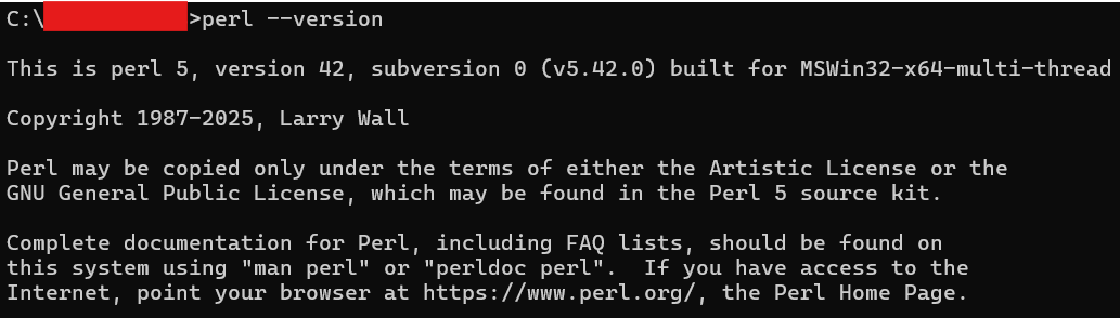 설치되어 시스템 환경 변수에 등록된 Perl은 위와 같이 cmd 창에서 확인할 수 있다