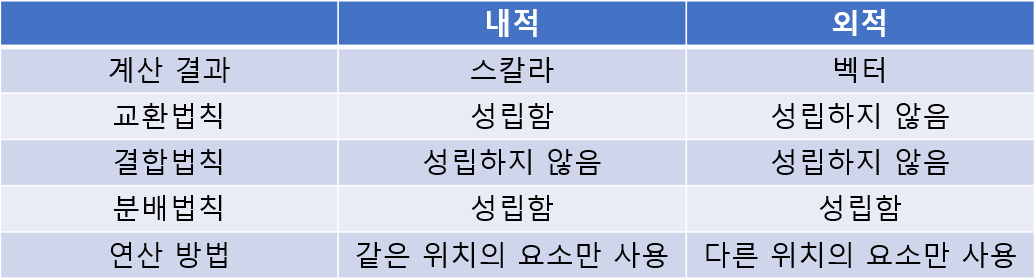 벡터와 내적의 차이를 최종적으로 정리하면 위와 같이 정리할 수 있다