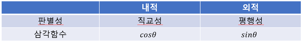 최종적으로 벡터의 내적과 벡터의 외적의 서로 대비되는 성질은 위와 같이 정리할 수 있다