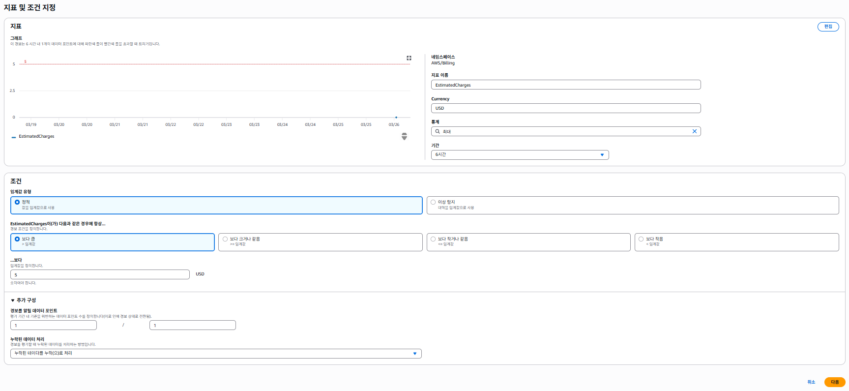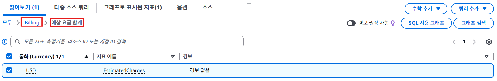 현재 리전이 북미 리전(us-east-1)으로 설정되어 있는지 확인하고, 지표를 Billing - 예상 요금 합계로 설정한다