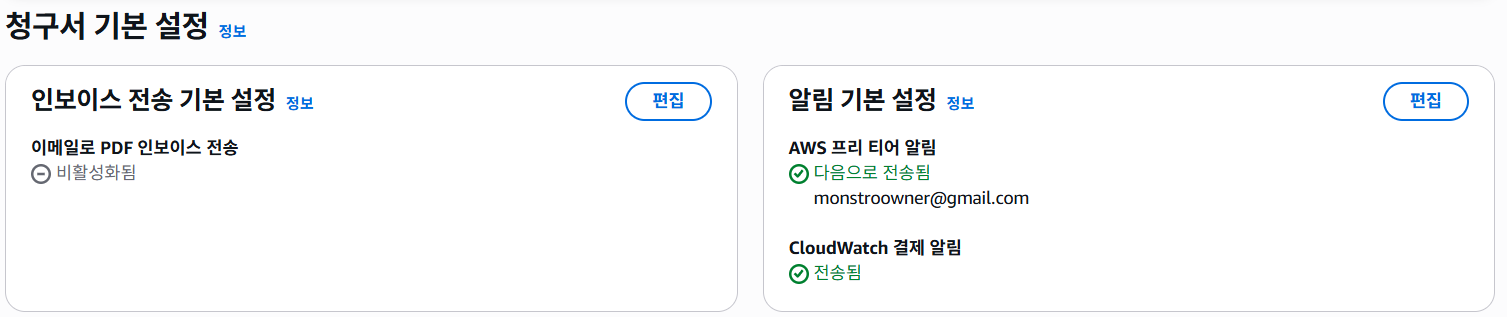 결제 및 비용 관리 - 빌링 기본 설정 탭에서 결제 알림 + Free Tier 한계치 알림을 설정할 수 있다