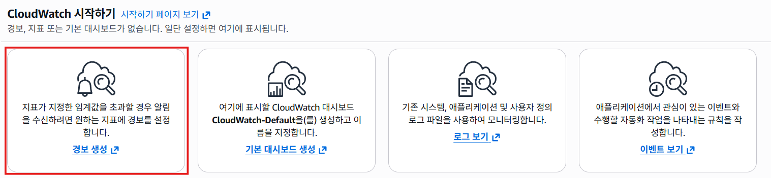 새로 알림을 생성하기 위해서는 CloudWatch 탭 - 경보 생성 탭을 선택하면 된다