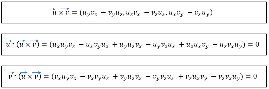 두 개의 벡터 u와 v의 외적에 대해 u와 v를 각각 내적하게 되면 항상 0의 결과값이 나오는 것을 확인할 수 있다