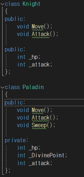 따라서 성기사와 기사는 Is-A 관계이므로, 성기사 클래스와 기사 클래스는 상속을 통해 관계를 맺는 것이 바람직합니다.