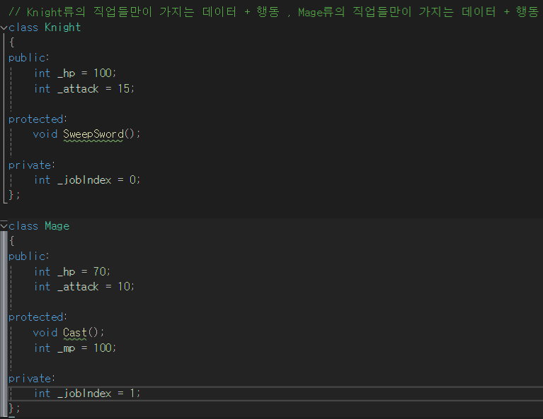 직업들이 공통적으로 가져야 하는 능력치는 public으로써 외부에서도 접근할 수 있게 설계하였고,