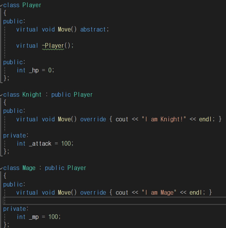 Player 클래스의 Move() 메서드 옆에 abstract라는 키워드가 수식되어 있습니다.