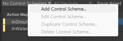 Action Asset의 좌측 상단의 Add Control Scheme을 통해 생성할 수 있습니다.