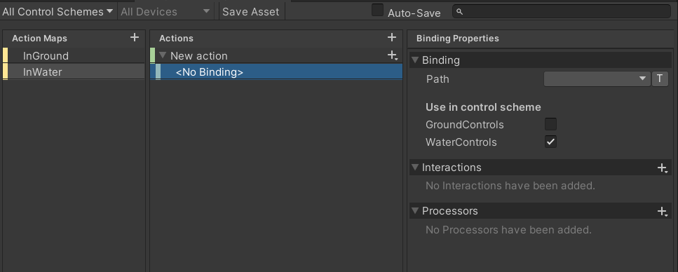 생성한 Control Schemes에서 관리할 Action들을 선택하여 연결한 것을 위와 같이 확인할 수 있습니다.