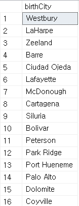 -- birthCity 속성의 데이터에서 중복을 없애고 데이터를 가져옴