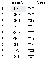 -- teamID와 홈런 총합을 homeRuns라는 이름으로 가져오고 내림차순 정렬