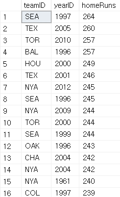 이때 HAVING 연산자까지는 homeRuns라는 속성이 만들어지지 않아