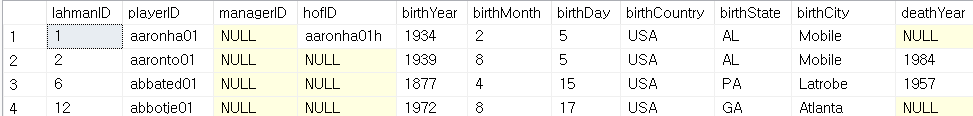위의 쿼리는 players 테이블의 playerID를 battingpost 테이블의 PlayerID에 있는지 판단하여
