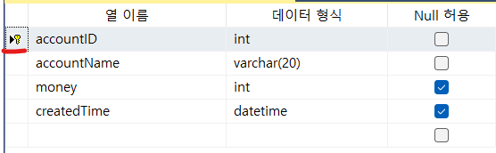 위의 쿼리를 통해 accountID 열에 PRIMARY KEY 제약조건을 설정합니다.