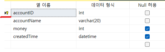 -- 열은 각각 accountID / accountName / money / createdTime 들로 구성