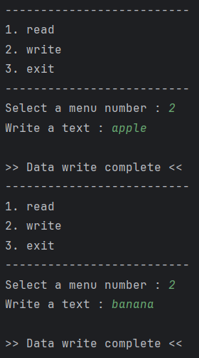 2를 입력하면 파일을 쓰는데, 작성한 결과마다 개행하여 문단을 구분한다