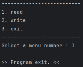 무한 반복문을 돌면서 3개의 숫자를 입력받아 읽기 / 쓰기 / 종료를 수행한다