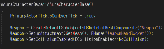 Character 클래스에서 상속되었으며 제공된 생성자와 BeginPlay 함수외에 멤버변수로 Weapon을 추가하였다
