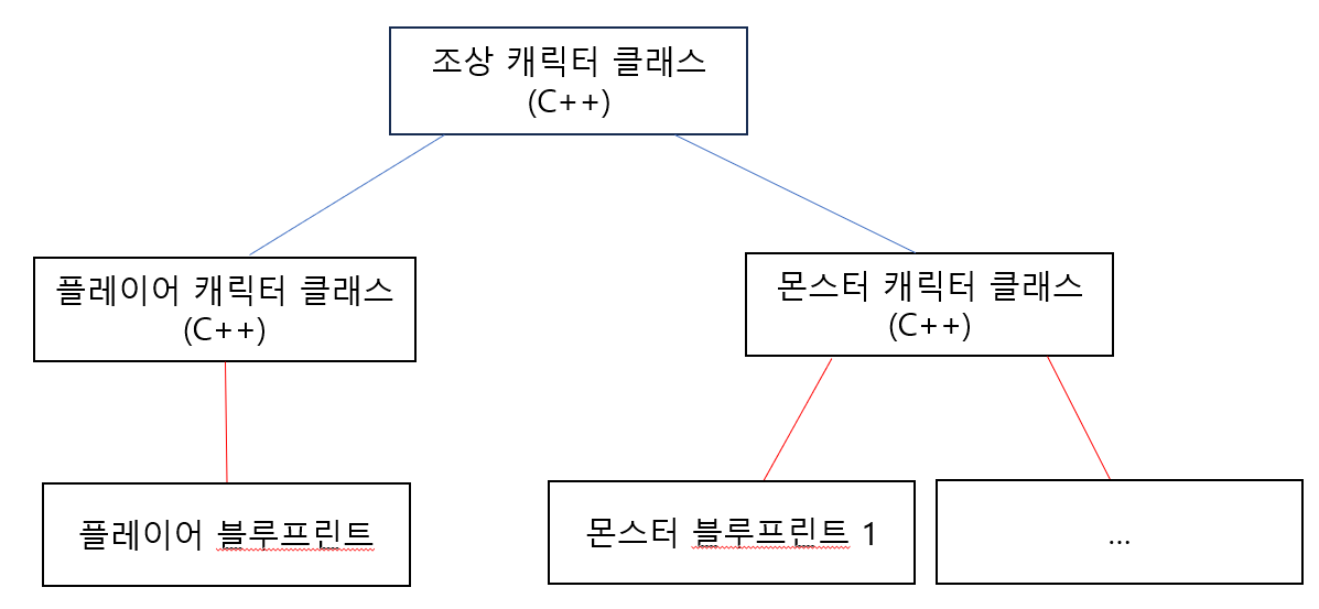 기본적인 틀만 C++ 클래스로 잡고, 틀에서 파생되는 여러 객체들은 블루 프린트로 구현하도록 한다