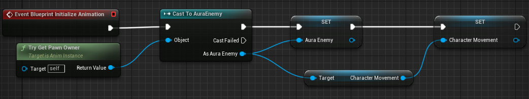 애니메이션 블루 프린트의 Init에서는 PawnOwner를 가져와 플레이어 블루 프린트로 캐스팅하고 변수에 저장한다