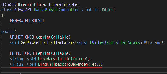 OverlayWidgetController에 BindCallbacksToDependencies 함수를 추가하고 오버라이드한다