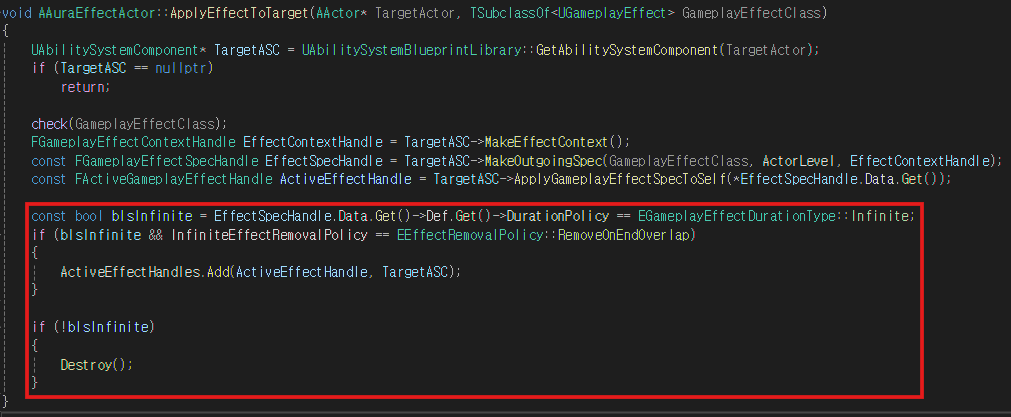 만약, Infinite GameplayEffect가 아니라면 해당 GE를 적용하는 EffectActor를 파괴한다
