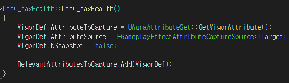 - 1) AttributeSet에서 Capture할 Vigor 어트리뷰트를 가져와 프로퍼티의 AttributeToCapture에 저장