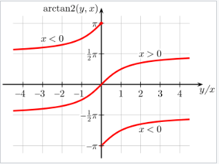 각의 크기를 x축으로 둔 atan2 함수의 그래프는 다음과 같으며, 공역은 -180°~180°의 범위를 가진다