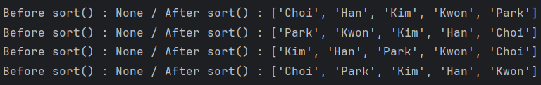 sort 함수가 호출되어 수정한 이후로는 수정된 원본이 출력되는 것을 확인할 수 있다