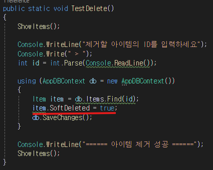 Item 클래스에 플래그 프로퍼티로 사용할 SoftDeleted 프로퍼티를 추가하였습니다.