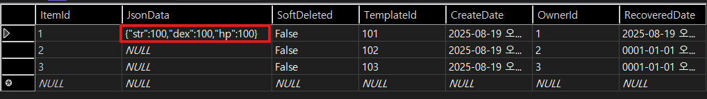 Item 엔티티 클래스에 새로운 filed인 _jsonData를 추가하고 ItemOption 구조체의 데이터를 저장합니다.