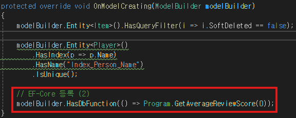 HasDbFunction 함수를 사용하여 Program 클래스의 static 함수를 UDF 함수로 설정하였습니다.