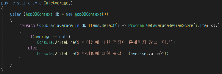 GetAverageReviewScore 함수를 호출하여 아이템의 ID에 따라 평점을 출력합니다.