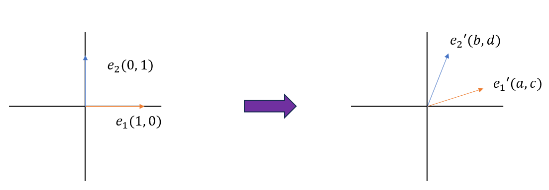위와 같이 두 개의 표준기저벡터 (1, 0)과 (0, 1)이 새로운 벡터 (a, c)와 (b, d)에 대응되어 변환된다고 가정한다