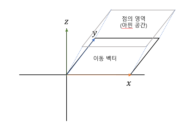 아핀 공간에서 점과 이동 벡터간의 상관관계는 다음과 같이 표현할 수 있다