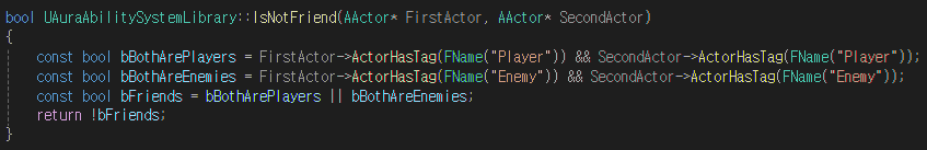해당 함수를 사용하여 플레이어 - 플레이어 / 몬스터 - 몬스터는 서로를 공격하지 않도록 설정할 수 있다