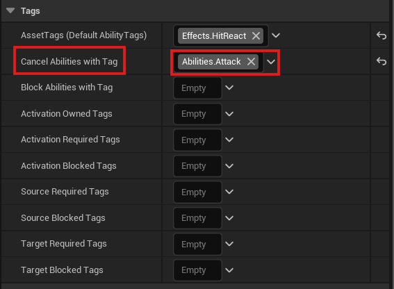 Cancel Abilities With Tag 설정을 위와 같이 진행하여 피격된다면 공격 어빌리티를 중단하도록 설정한다