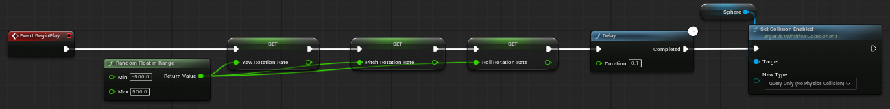 BeginPlay 이벤트를 구성하여 Yaw / Pitch / Roll을 랜덤한 값으로 설정한 후에 Sphere의 Collision을 설정한다