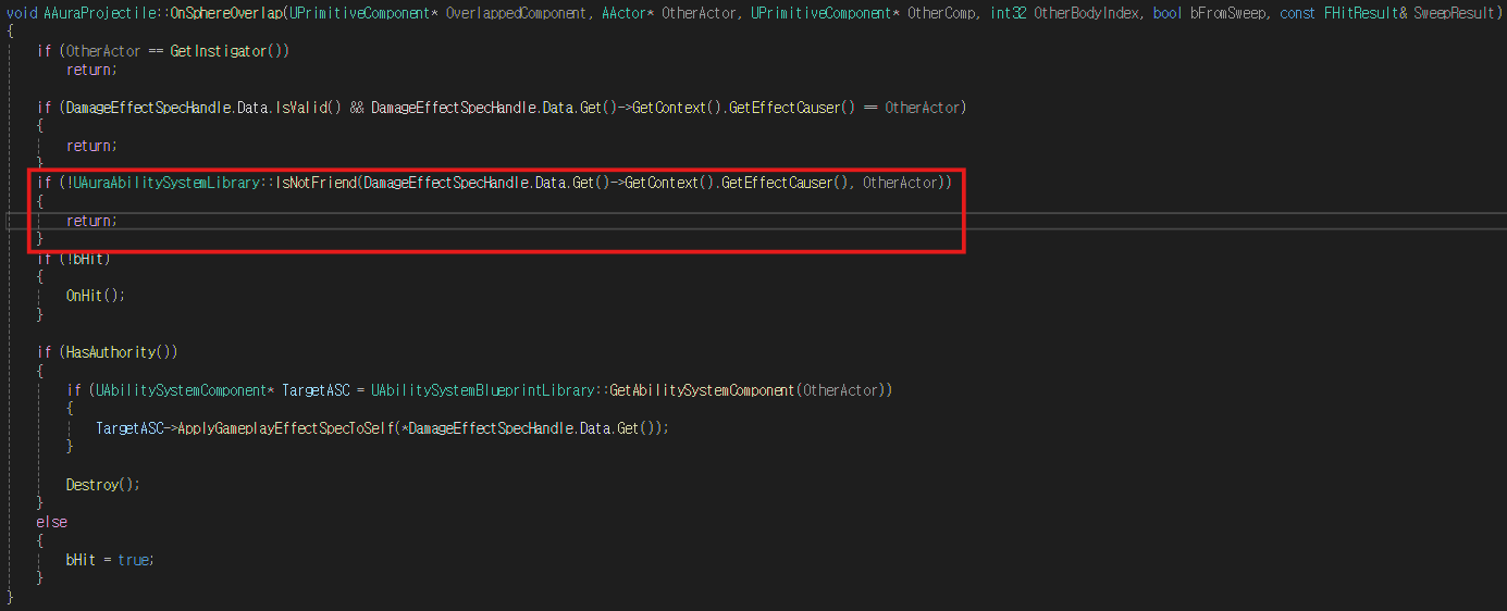 OnSphereOverlap 함수에 위의 로직을 추가하여 투사체가 같은 타입의 캐릭터에게 피해를 주지 않도록 설정한다