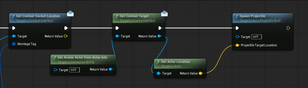 AvatarActor -> CombatTarget을 거쳐서 Target의 Location을 가져와 해당 Location으로 투사체를 생성한다