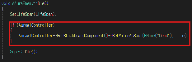 Die 함수에 위의 로직을 추가하여 몬스터가 쓰러지면 Blackboard의 Dead 키를 True로 설정한다
