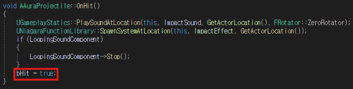 OnHit 함수를 위와 같이 수정하여 투사체가 피격되면 bHit을 True로 설정할 수 있도록 한다