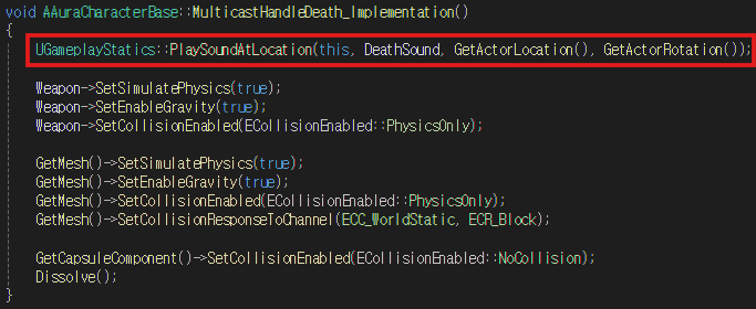HandleDeath 함수를 위와 같이 수정하여 몬스터가 쓰러지면서 추가한 SoundBase 멤버변수를 재생한다