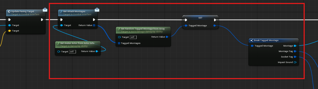 UpdateFacingTarget 함수를 호출하고 AttackMontages - 랜덤한 TaggedMontage를 가져오는 로직을 수행한다