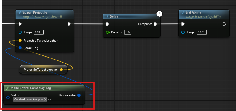 화염구는 무기의 끝에서 생성하므로 해당하는 CombatSocket을 지정하여 SpawnProjectile 노드에 넘겨준다