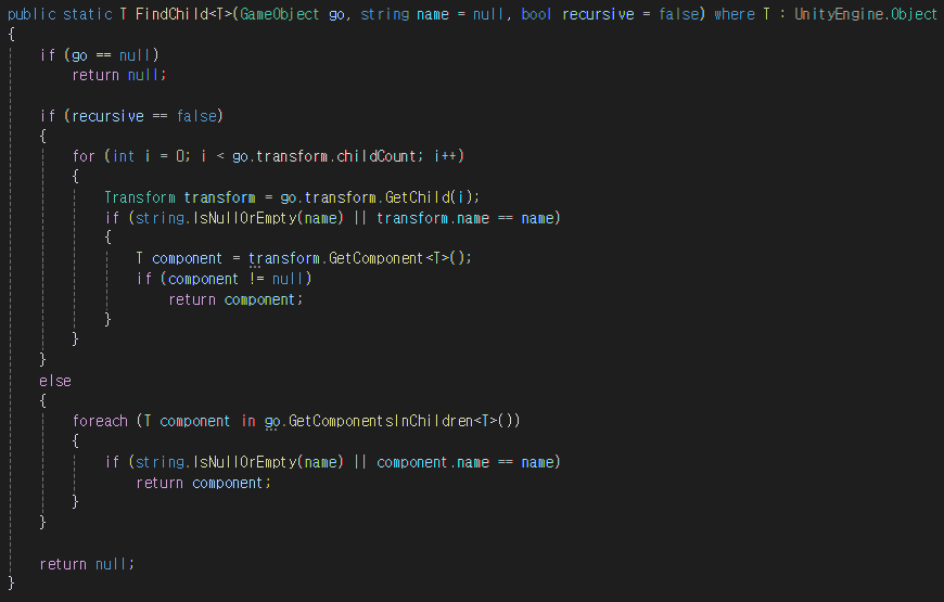 FindChild 함수는 내부에서 FindChild 제네릭 함수를 호출하고 Transform을 넘겨 하위 오브젝트를 반환한다