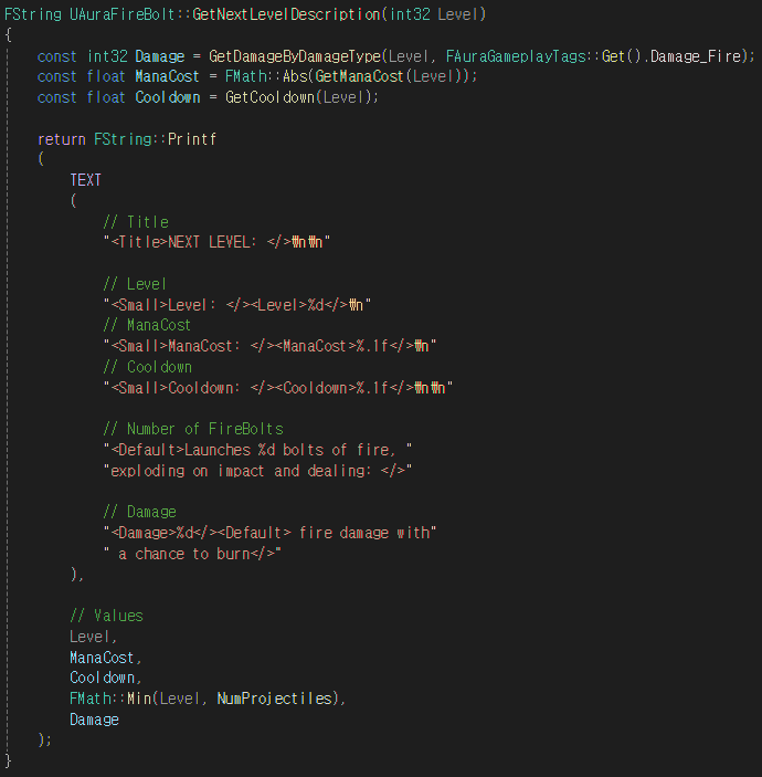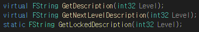 - GetNextLevelDescription 함수 : 다음 레벨의 스킬 어빌리티에 대한 설명을 가져오는 함수