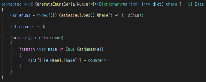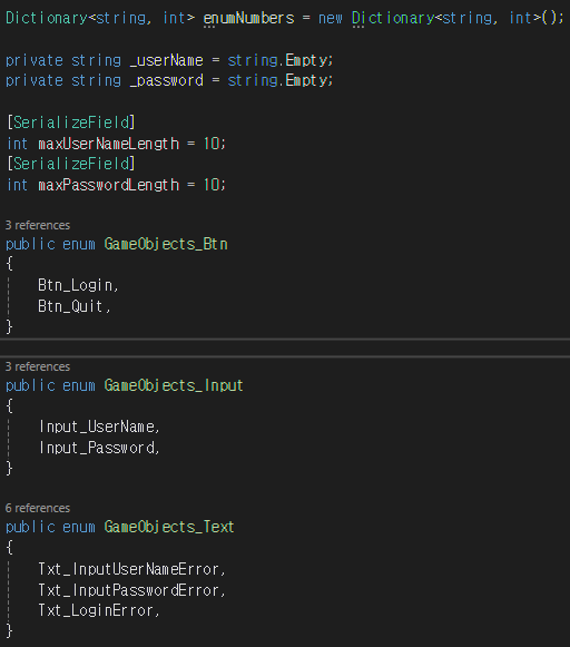 UI_Login 클래스 내부의 열거형의 멤버들을 정수값과 연결하여 enumNumbers에 저장한다